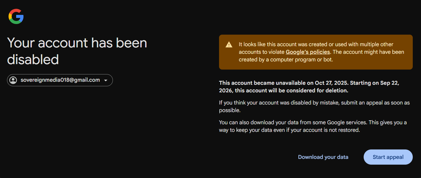 YouTube has taken down Sovereign Media’s YouTube and Gmail account under the claim that they were “created or used with multiple accounts to violate Google’s policies.”